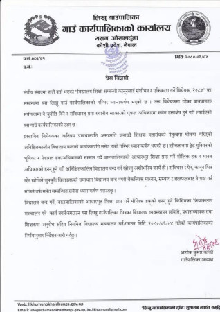 लिखु गाउँपालिकाले विद्यालय नियमित सन्चालन गर्न सम्पुर्ण शिक्षकहरुलाई निर्देशन