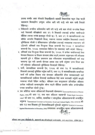 विद्यालयमा पठनपाठन गर्न पाउने हकबाट बञ्चित नगर्नूरनगराउनू ।’